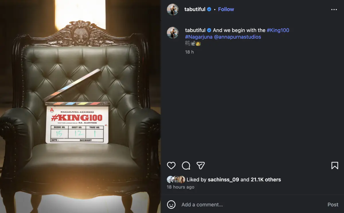 Tabu shared a photo on her Instagram, announcing her involvement and the start of the film. Tabu shared a photo of a clapperboard with the film's title placed on a black chair. She captioned it, "And we begin King 100." Tabu also included Nagarjuna's name in the hashtag and mentioned the makers.